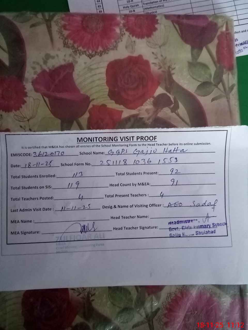 | Attendance Register | Head Teacher | MEA with School | Visit Proof |
