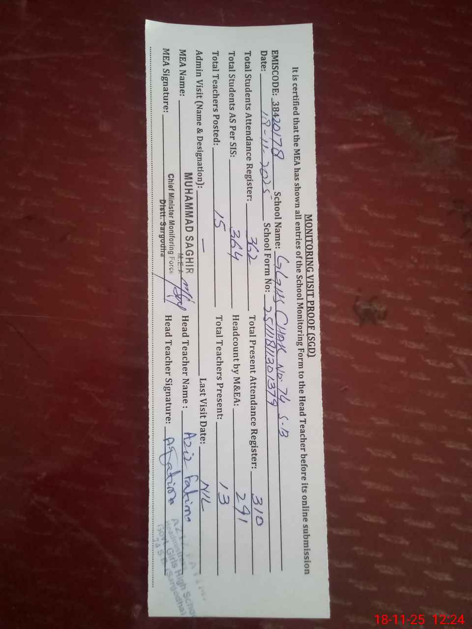 | EMIS Code: 38420178 | Name of School: GGHS CHAK NO.74 SB | |||