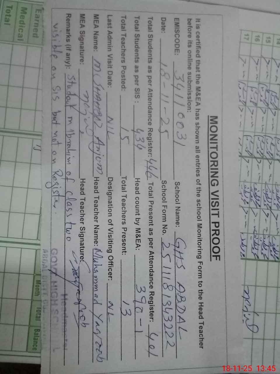 | Attendance Register | Head Teacher | MEA with School | Visit Proof |