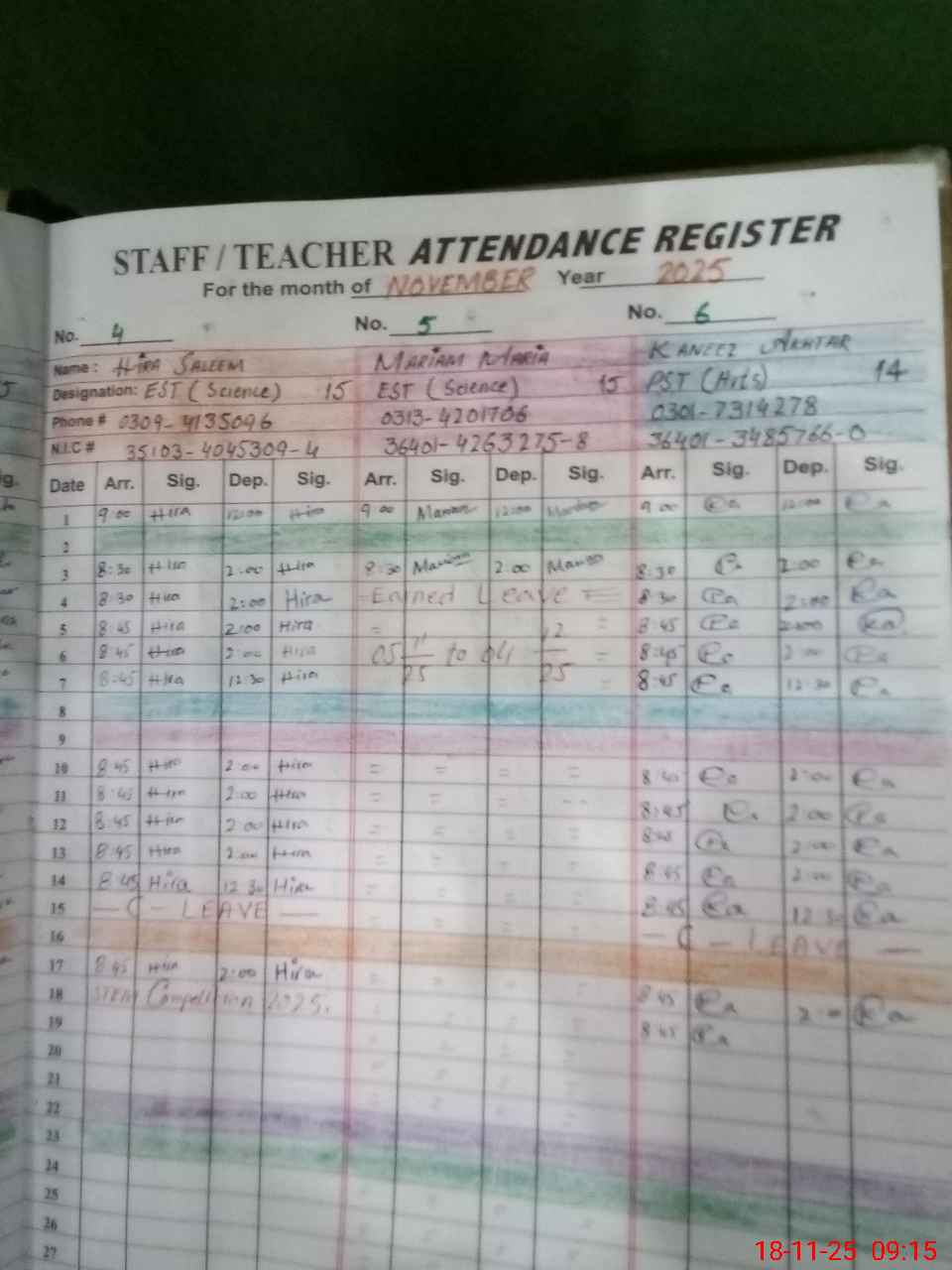 | CNIC | Full Name | Designation | R/C | Absence During Last Calender Month |