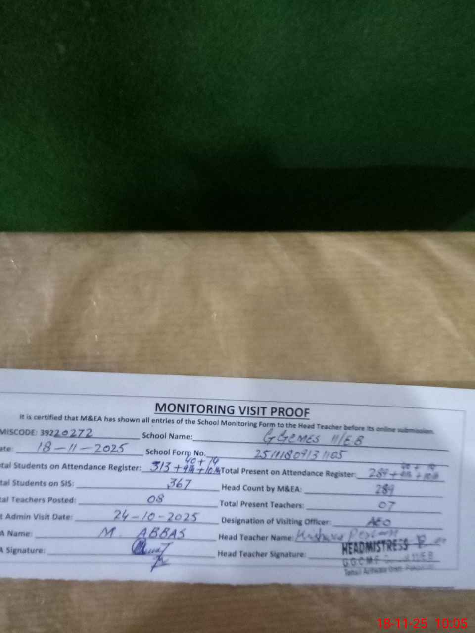 | Attendance Register | Head Teacher | MEA with School | Visit Proof |