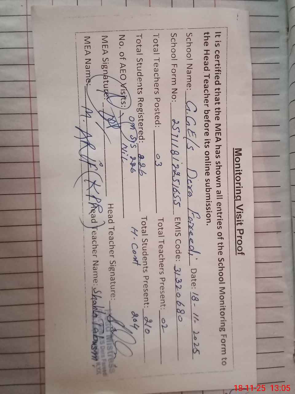 | Attendance Register | Head Teacher | MEA with School | Visit Proof |