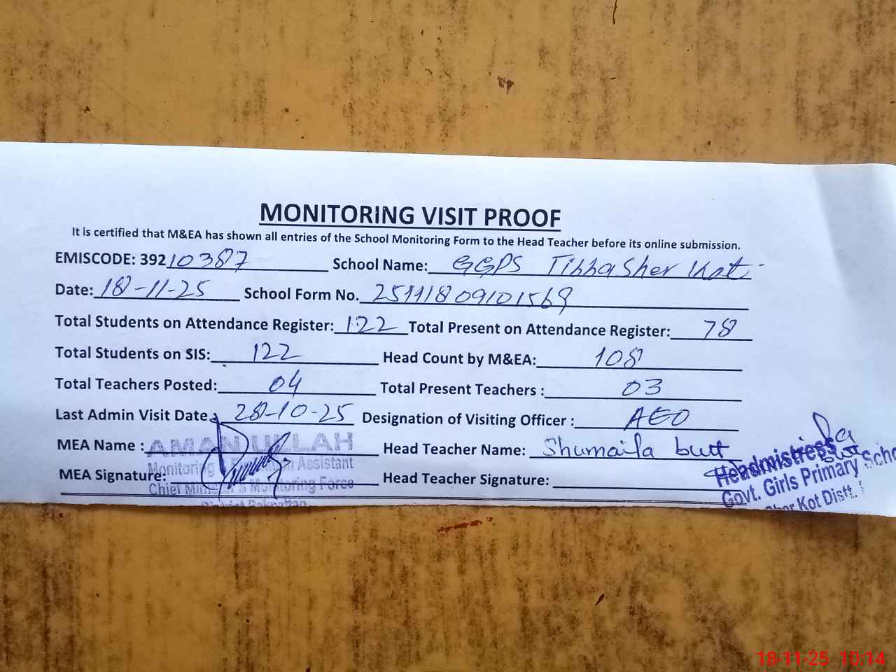 | Attendance Register | Head Teacher | MEA with School | Visit Proof |