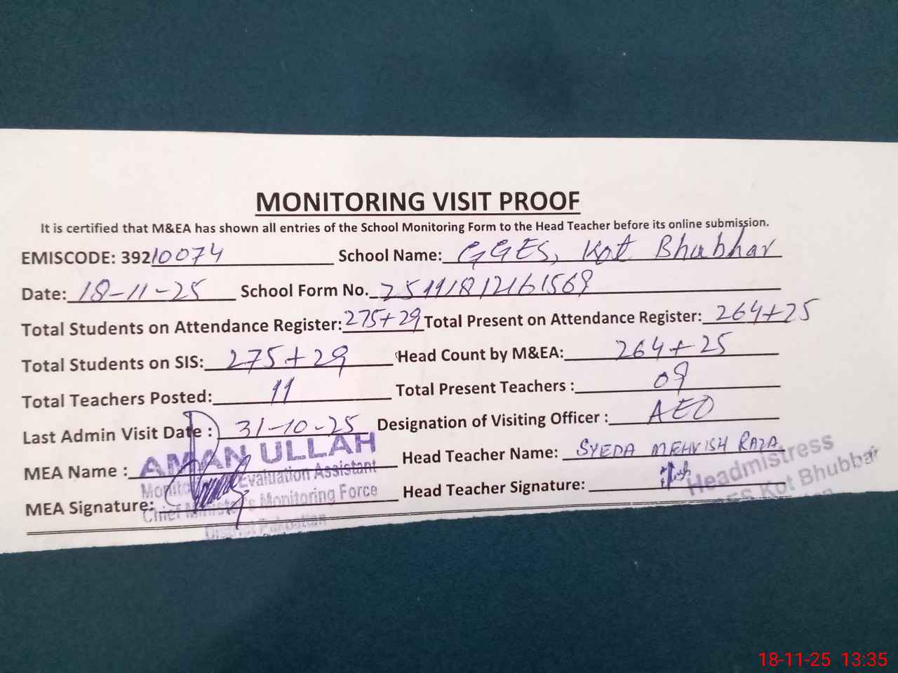 | EMIS Code: 39210074 | Name of School: GGES KOT BHUBHAR | |||