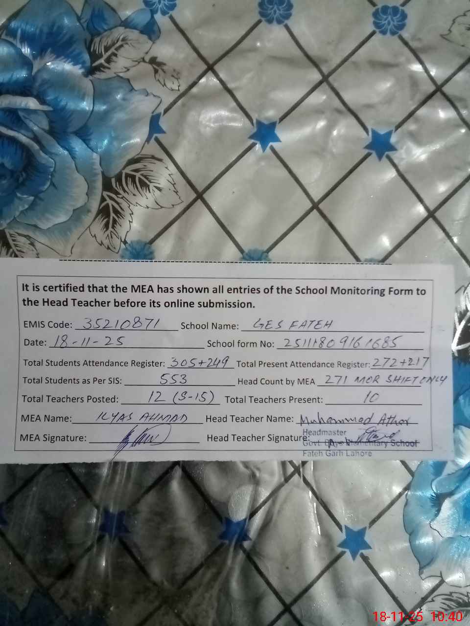 | Name: Mu**** At**** n Designation: (School Headmaster's/Headmistress's) EST Incharge Head Phone/Cell Number: 03**** |