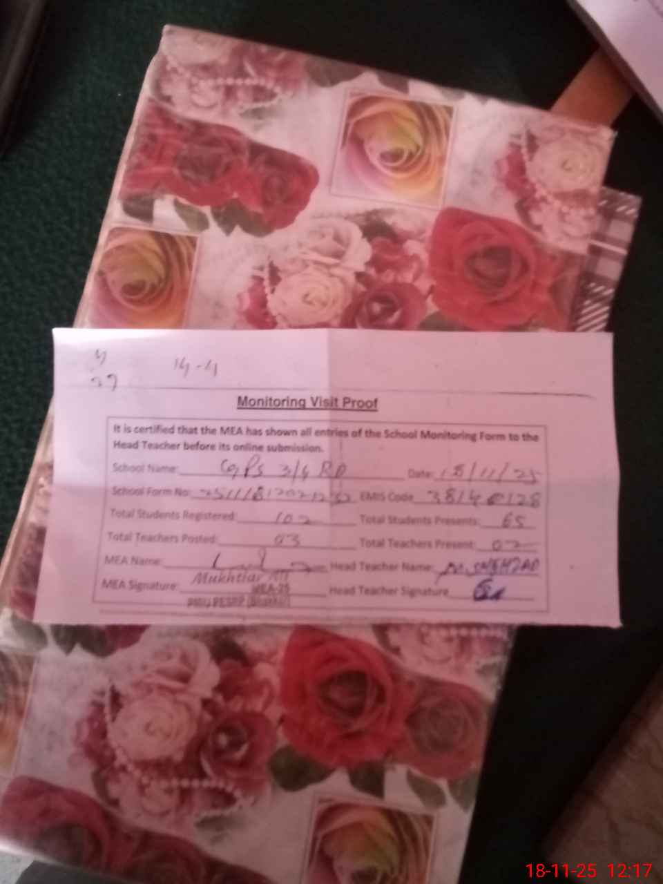 | Attendance Register | Head Teacher | MEA with School | Visit Proof |