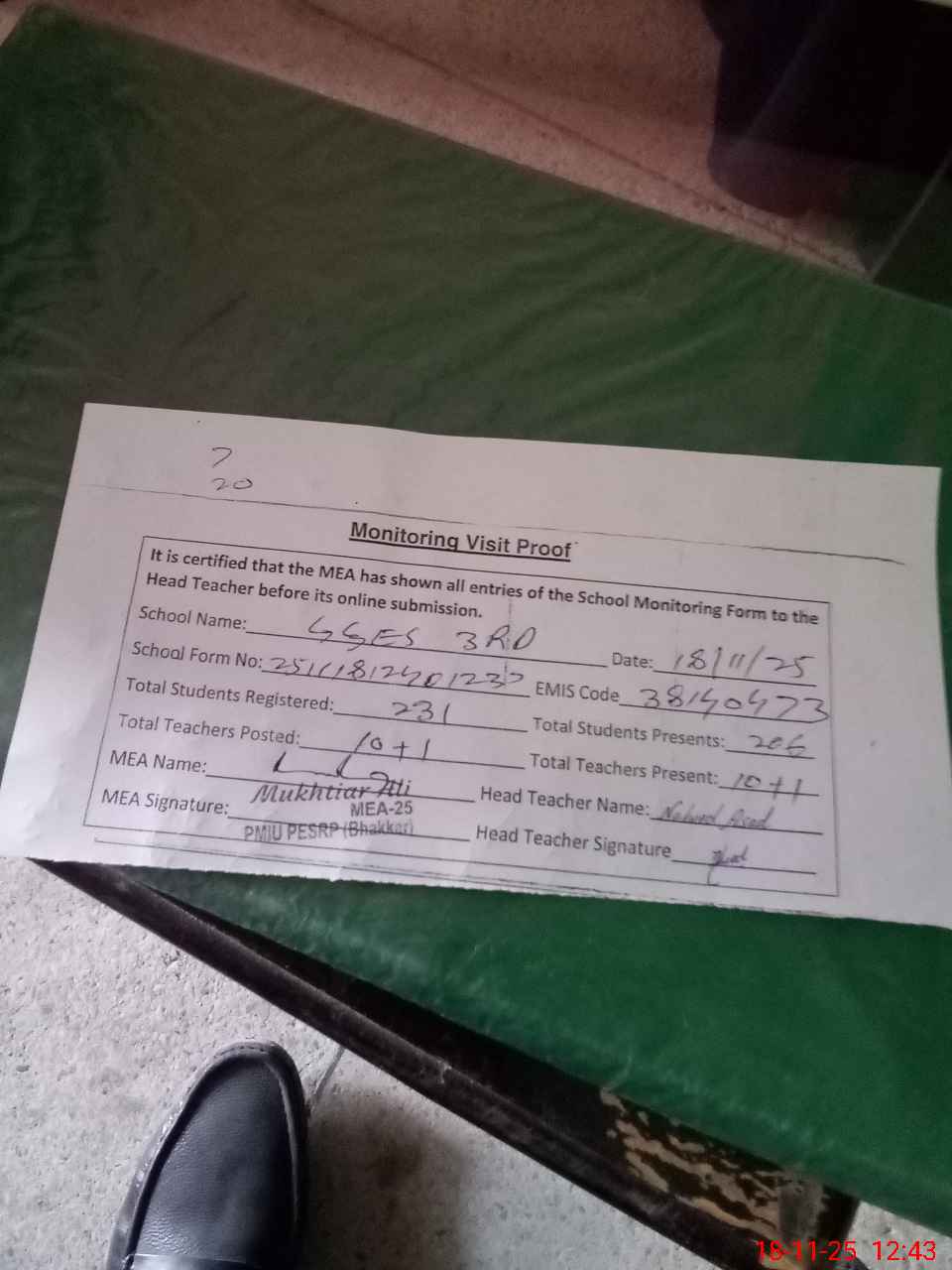 | Attendance Register | Head Teacher | MEA with School | Visit Proof |