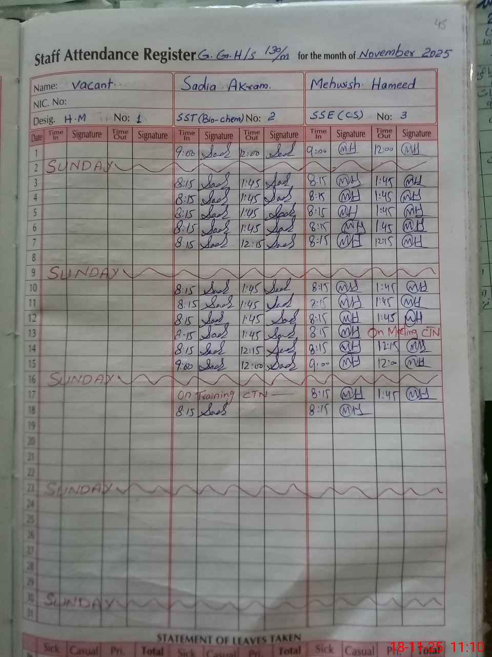 | CNIC | Full Name | Designation | R/C | Absence During Last Calender Month |