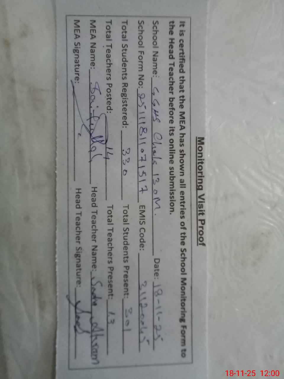 | Attendance Register | Head Teacher | MEA with School | Visit Proof |