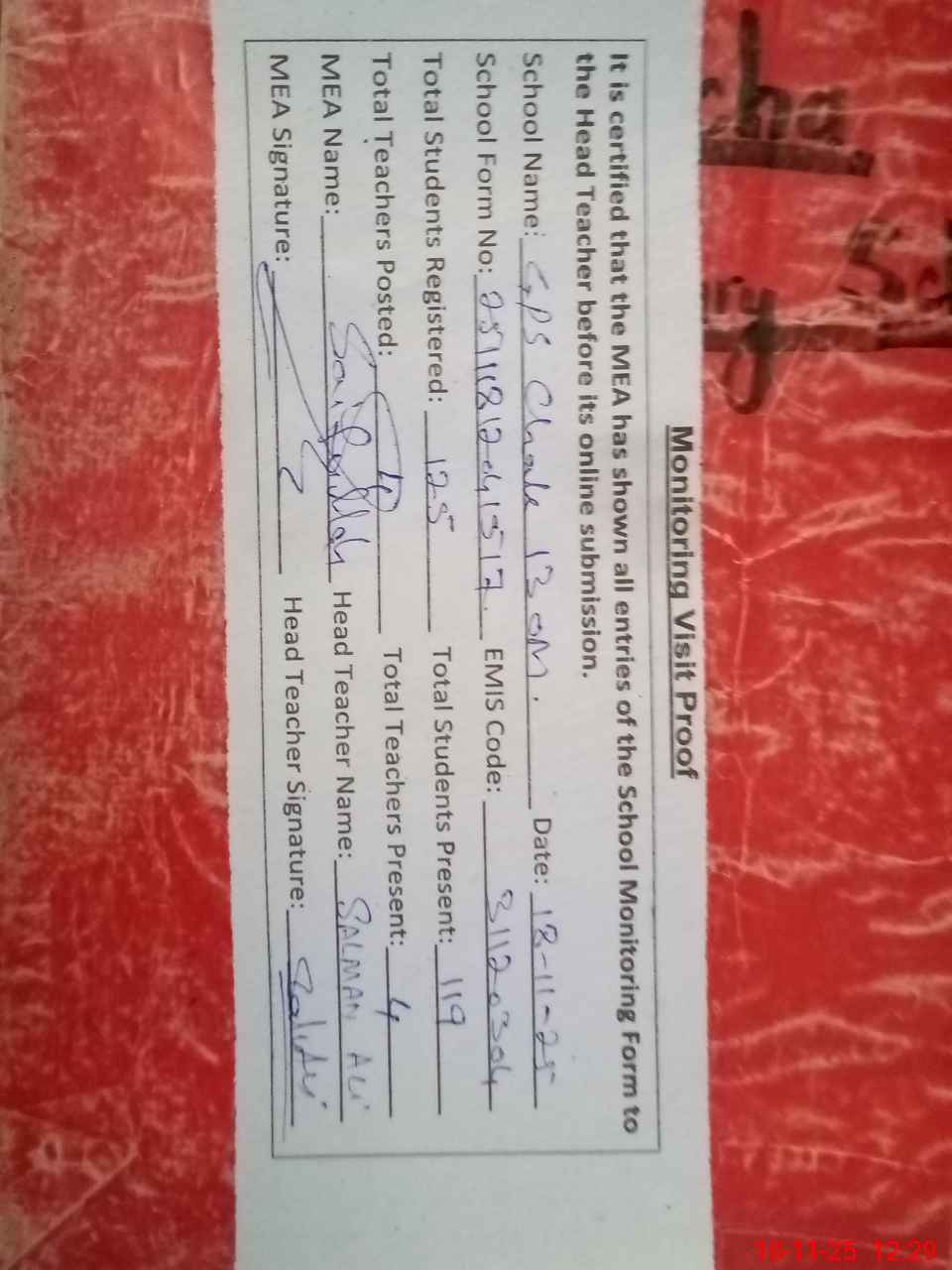 | Attendance Register | Head Teacher | MEA with School | Visit Proof |