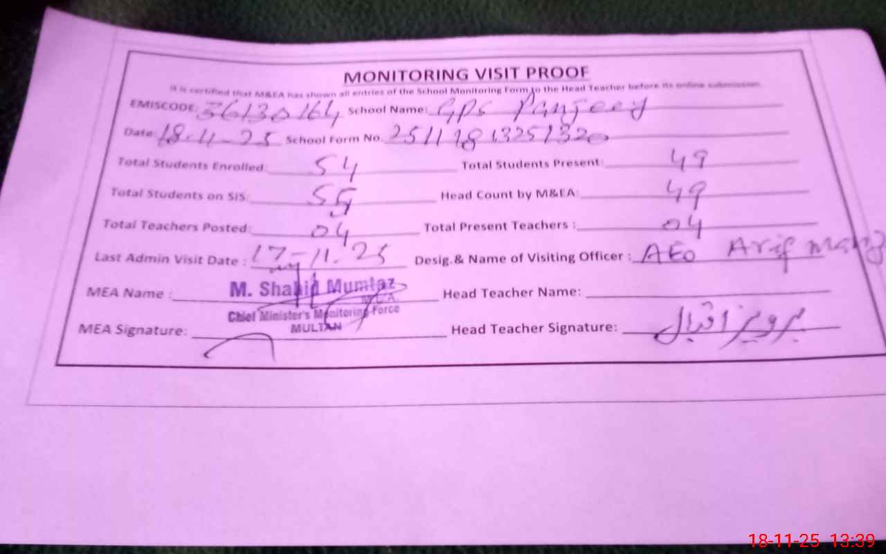 | EMIS Code: 36130164 | Name of School: GPS PANJEERY P/O JHOKE WAINS MULTAN | |||