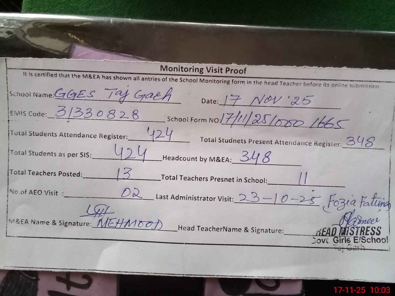 | Attendance Register | Head Teacher | MEA with School | Visit Proof |