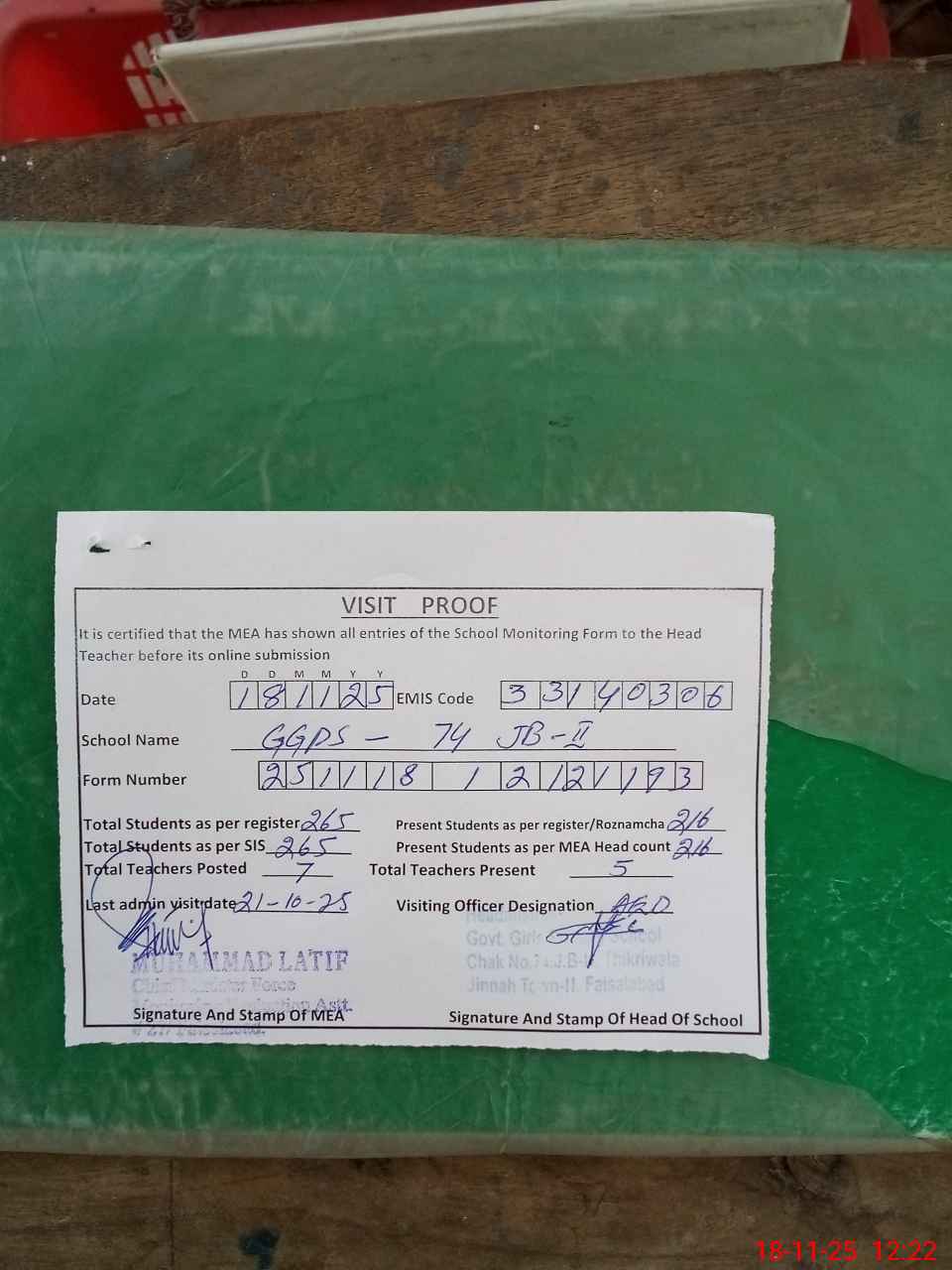 | EMIS Code: 33140306 | Name of School: GGPS CHAK NO 74 JB II | |||