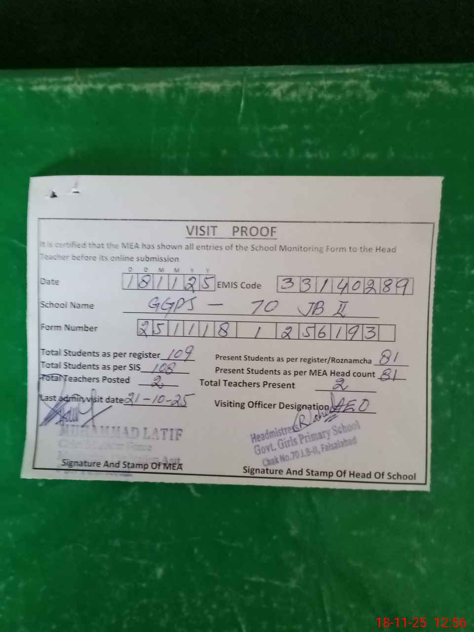 | EMIS Code: 33140289 | Name of School: GGPS CHAK 70 JB II | |||