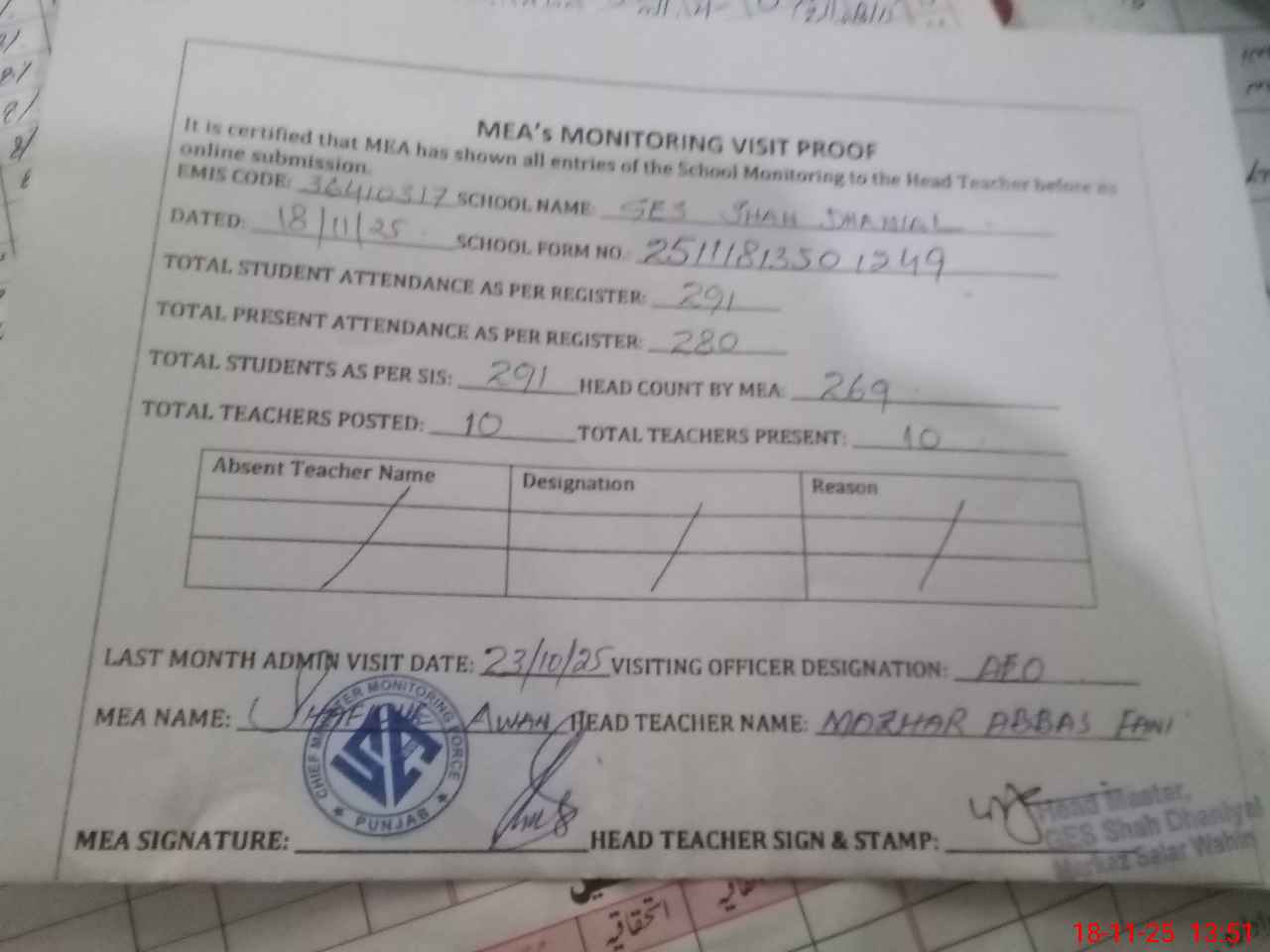 | Attendance Register | Head Teacher | MEA with School | Visit Proof |