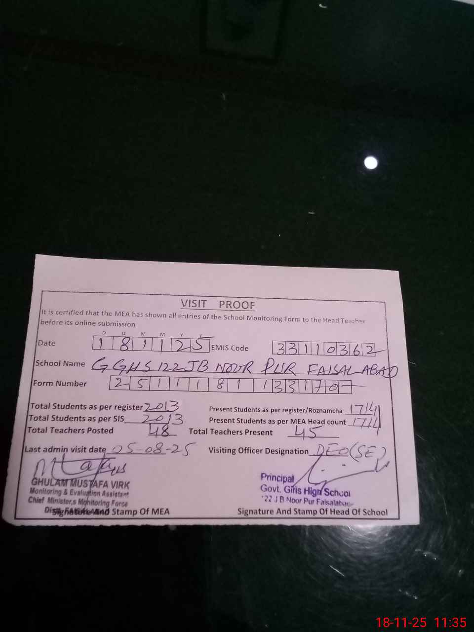 | Certified that this School was Inspected by the Undersigned MEA/DMO Today and the Information Stated Above is as Per Record. | |||||