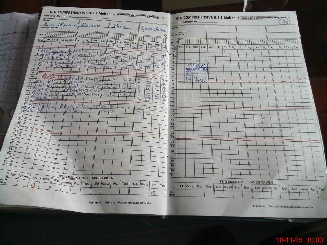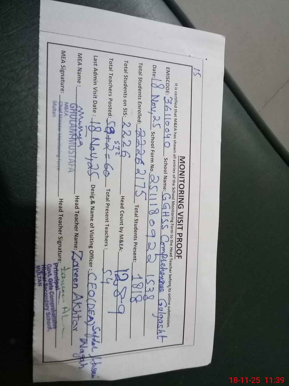 | Monitoring Date: 18-11-2025 | Start Time: 18-11-2025 09:22 AM | End Time: 18-11-2025 11:39 AM | Name of MEA: Gh**** Mu**** | |