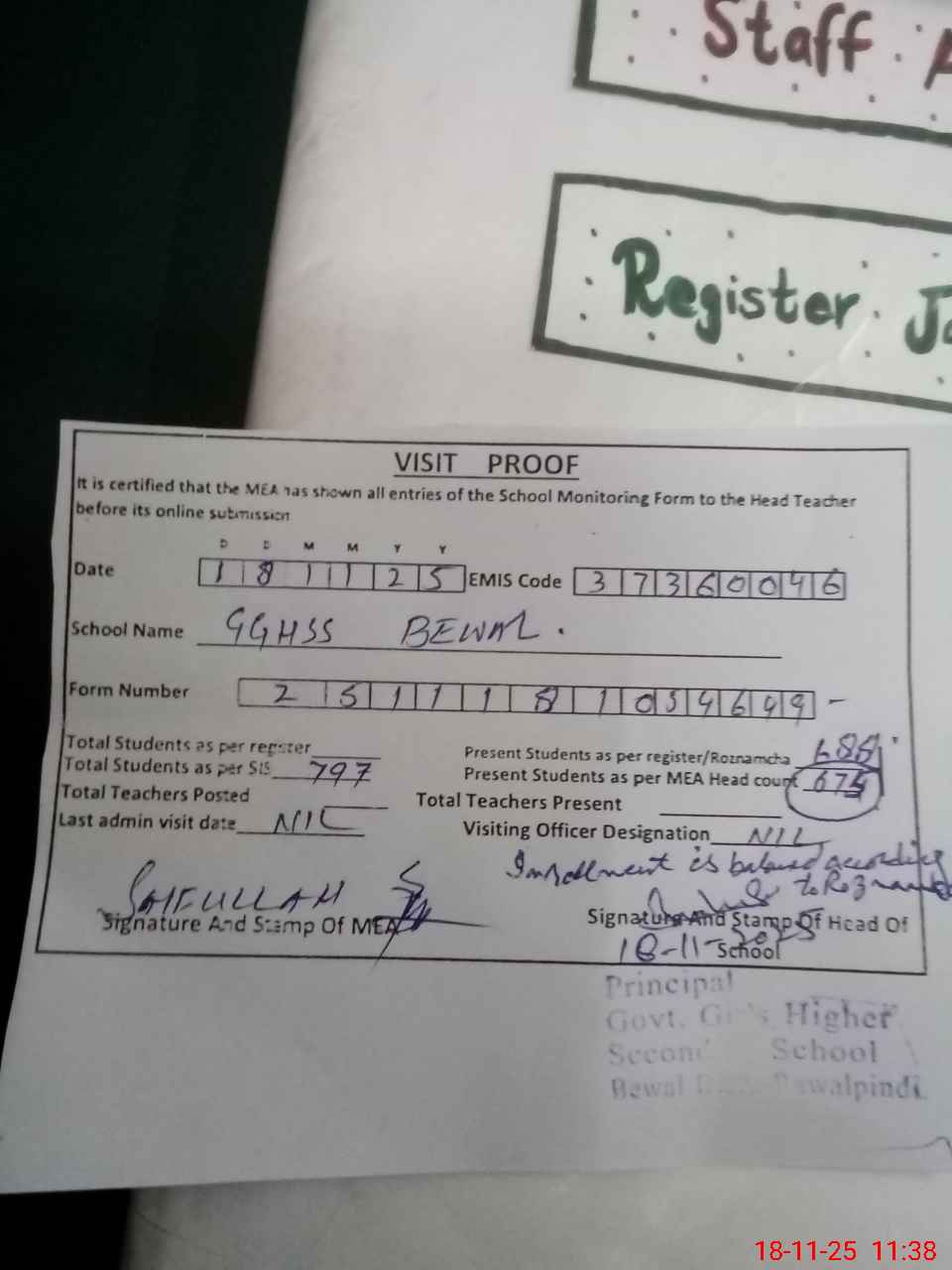 | Attendance Register | Head Teacher | MEA with School | Visit Proof |