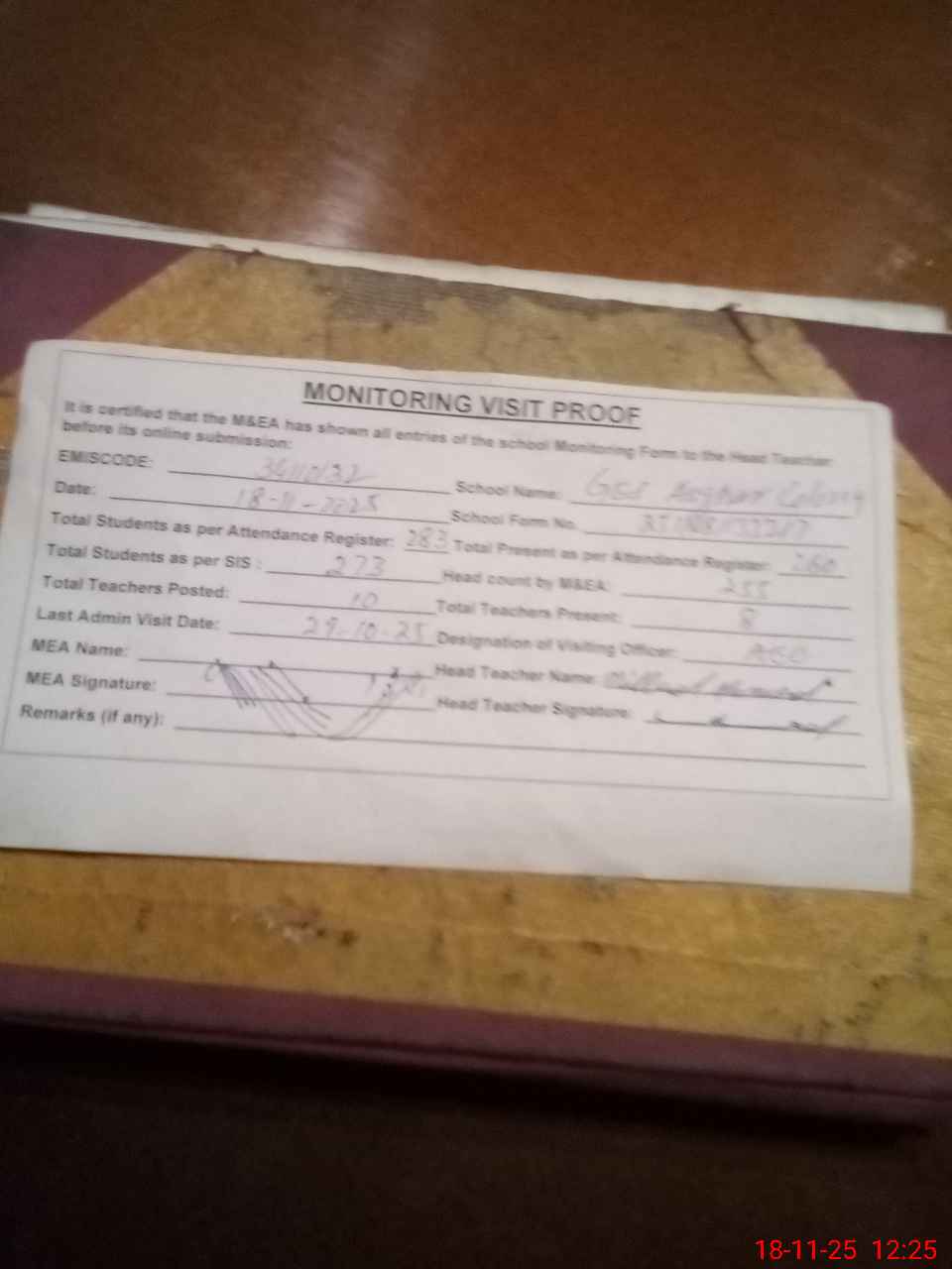 | Attendance Register | Head Teacher | MEA with School | Visit Proof |