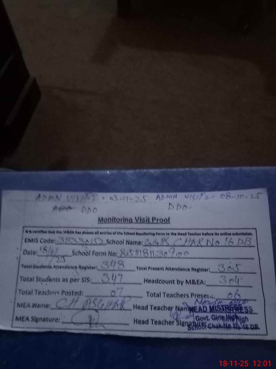 | Attendance Register | Head Teacher | MEA with School | Visit Proof |