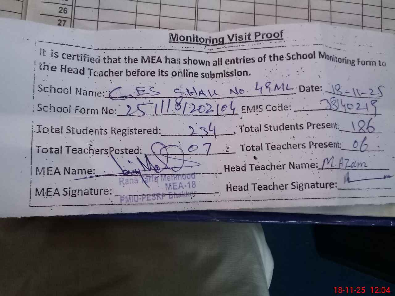 | Attendance Register | Head Teacher | MEA with School | Visit Proof |