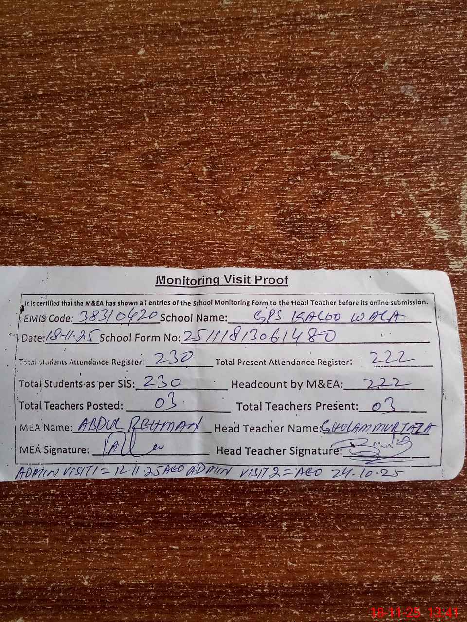 | Attendance Register | Head Teacher | MEA with School | Visit Proof |