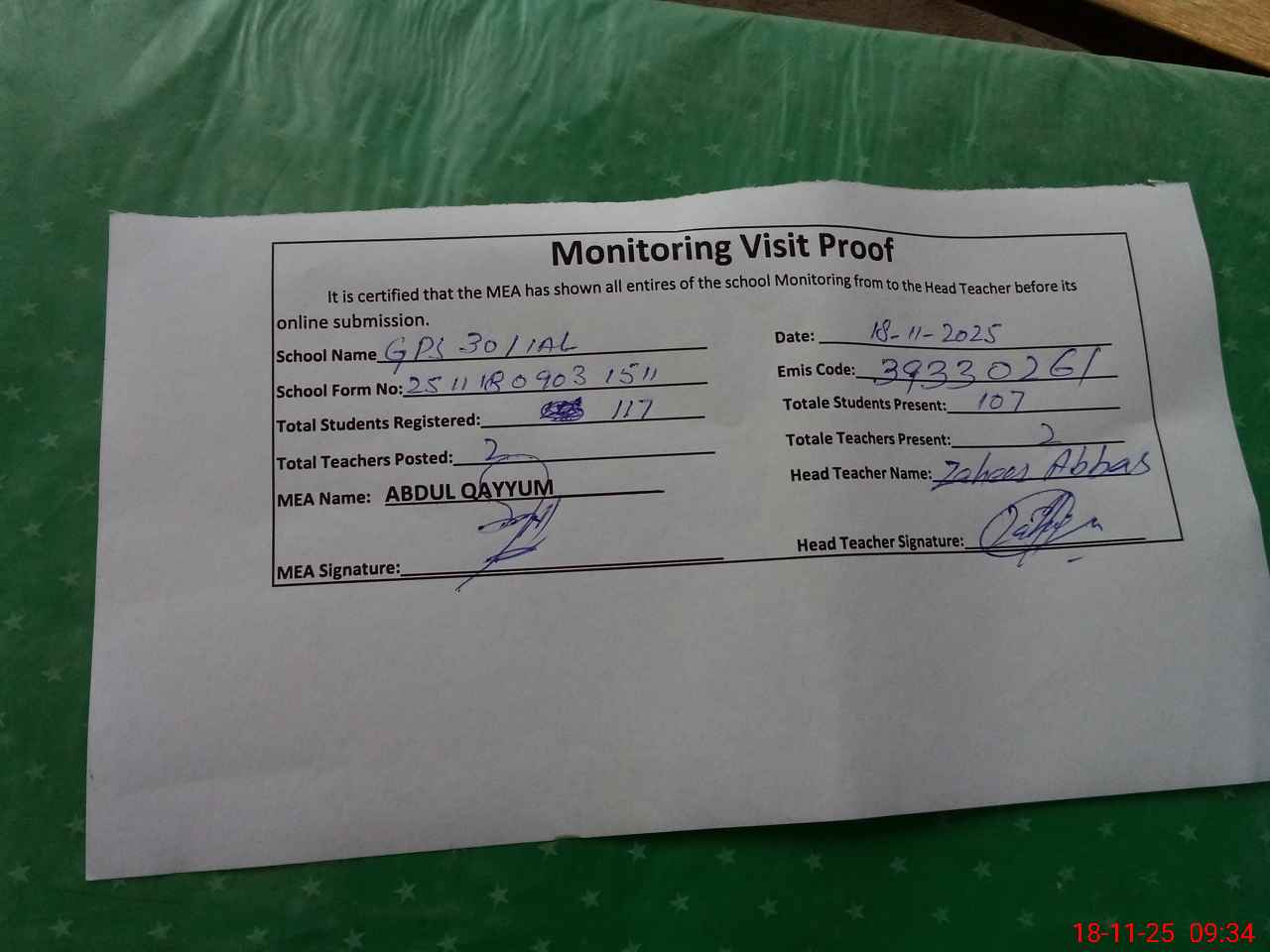 | Attendance Register | Head Teacher | MEA with School | Visit Proof |