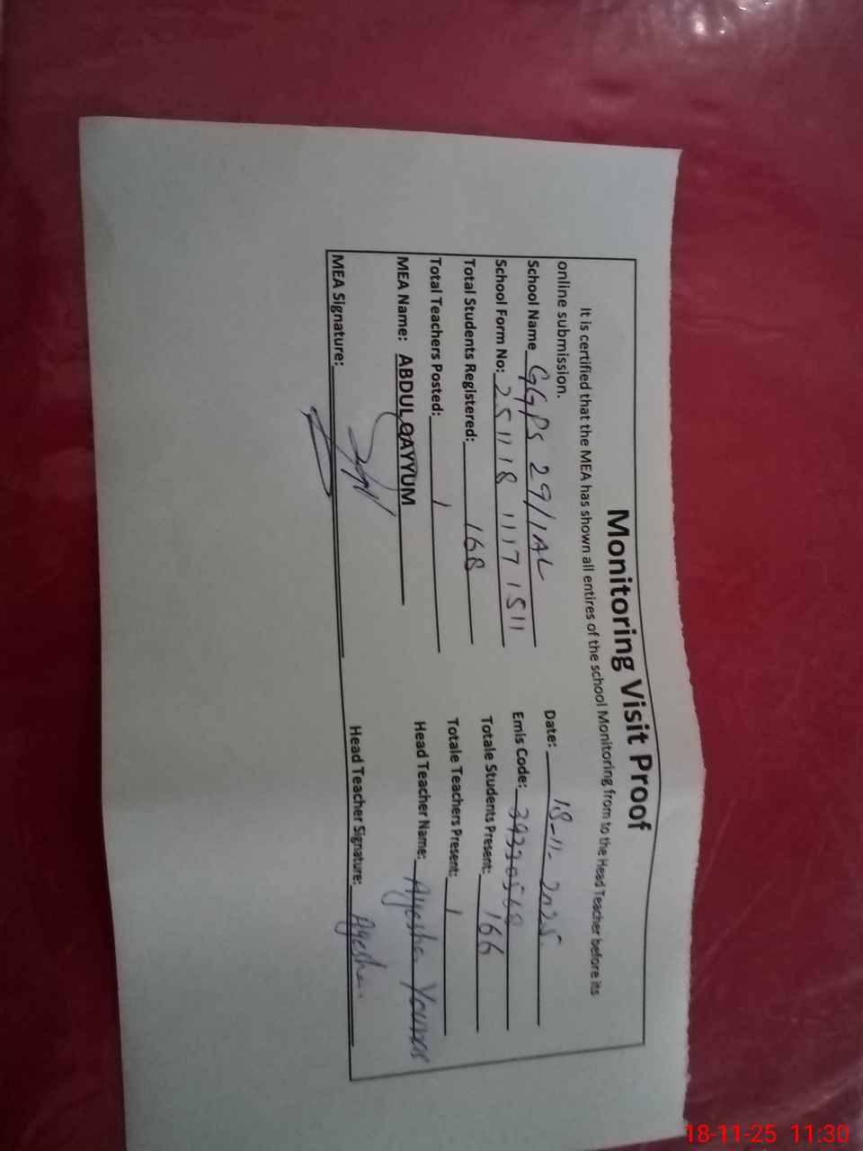 | Attendance Register | Head Teacher | MEA with School | Visit Proof |