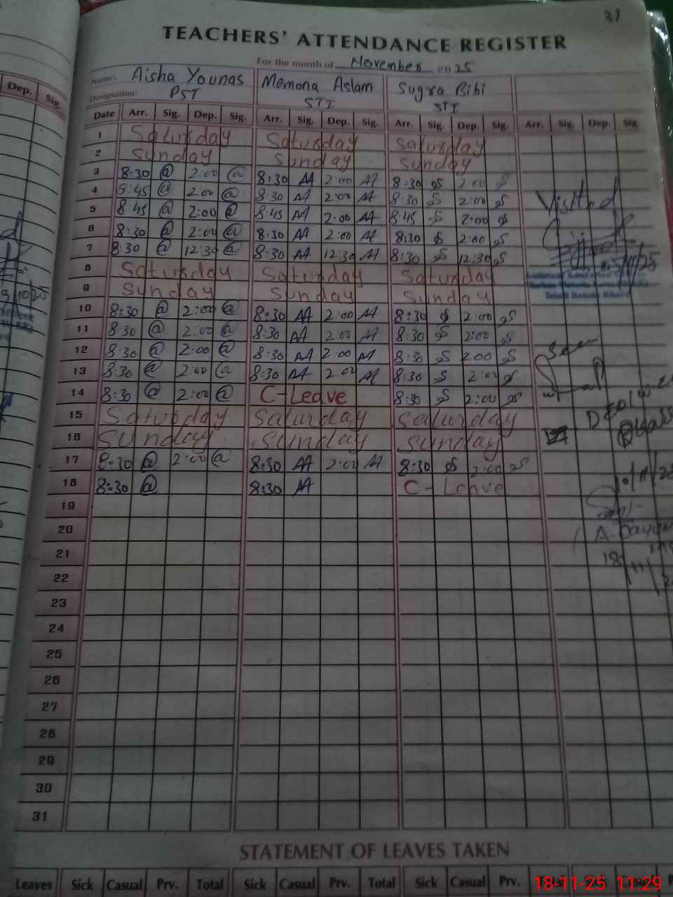 | CNIC | Full Name | Designation | R/C | Absence During Last Calender Month |