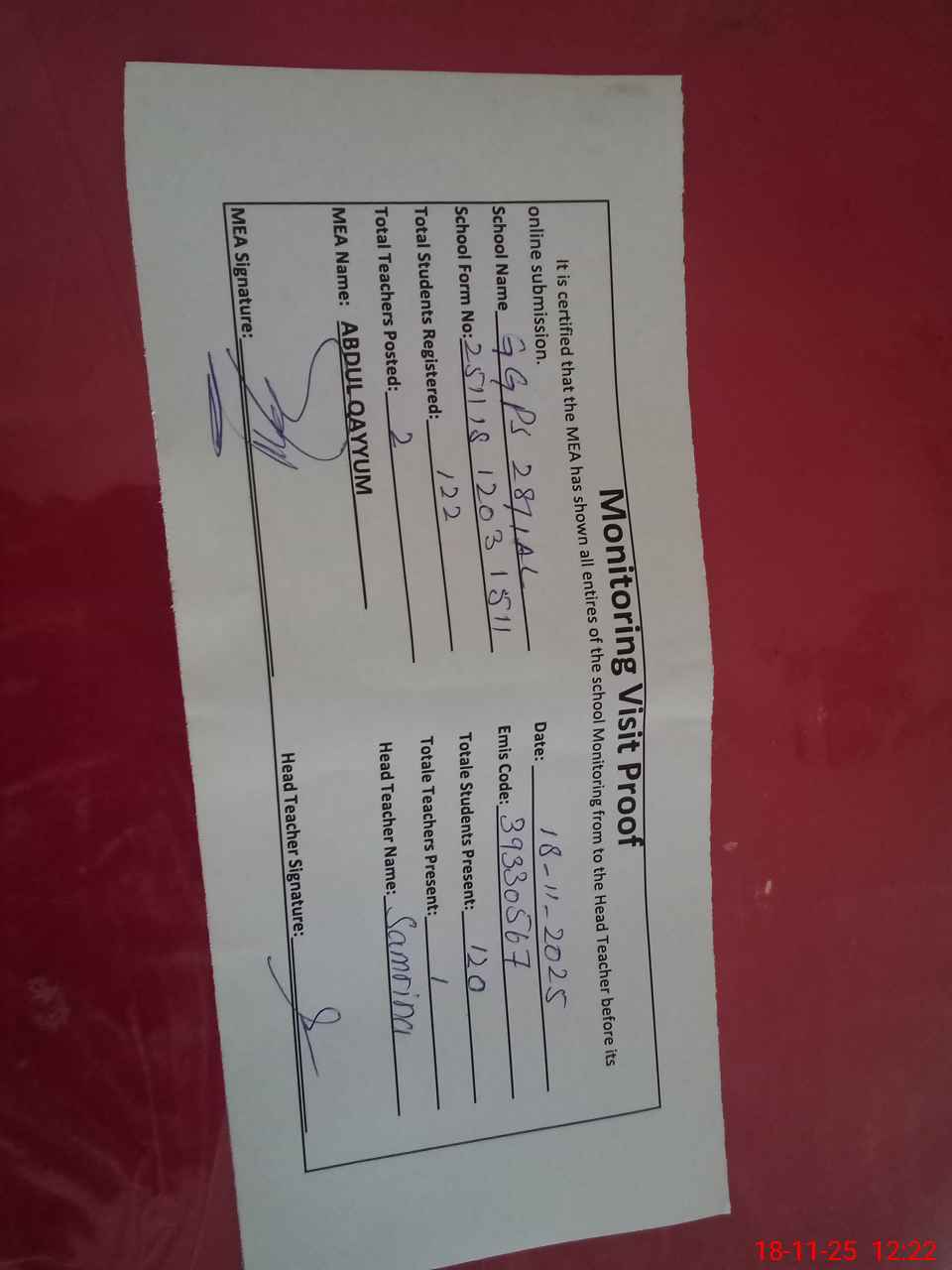 | Attendance Register | Head Teacher | MEA with School | Visit Proof |