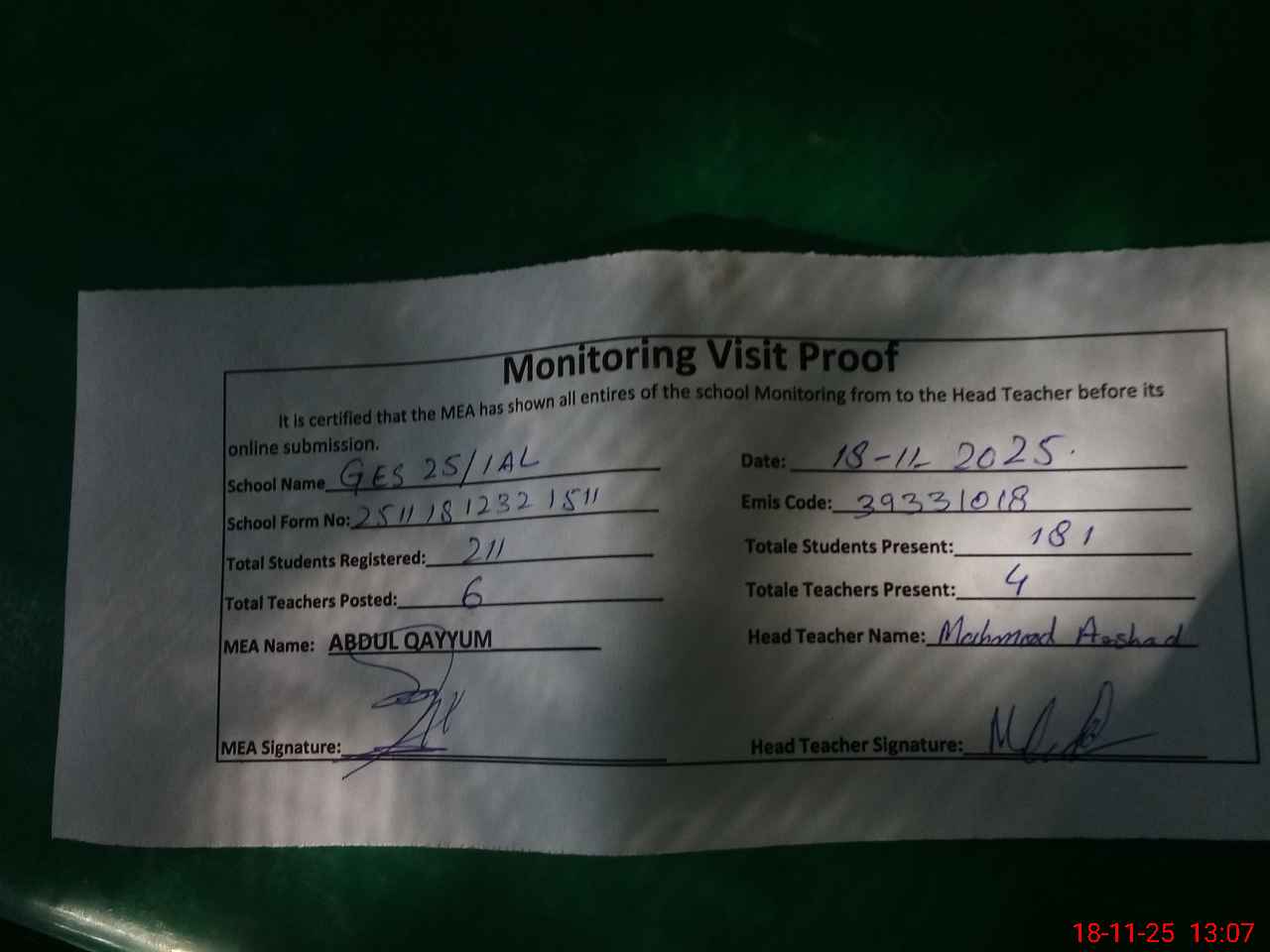 | Attendance Register | Head Teacher | MEA with School | Visit Proof |