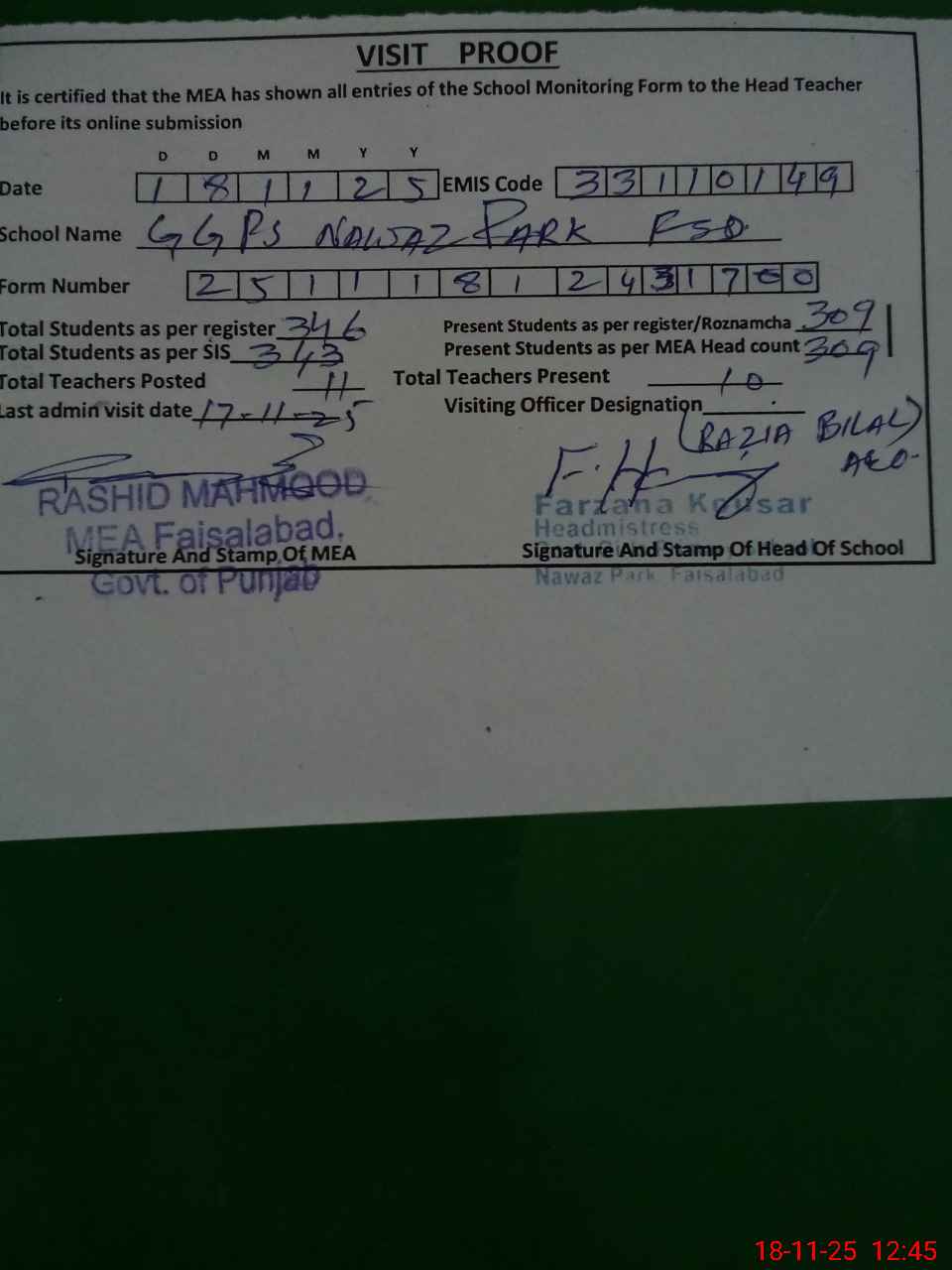 | Attendance Register | Head Teacher | MEA with School | Visit Proof |