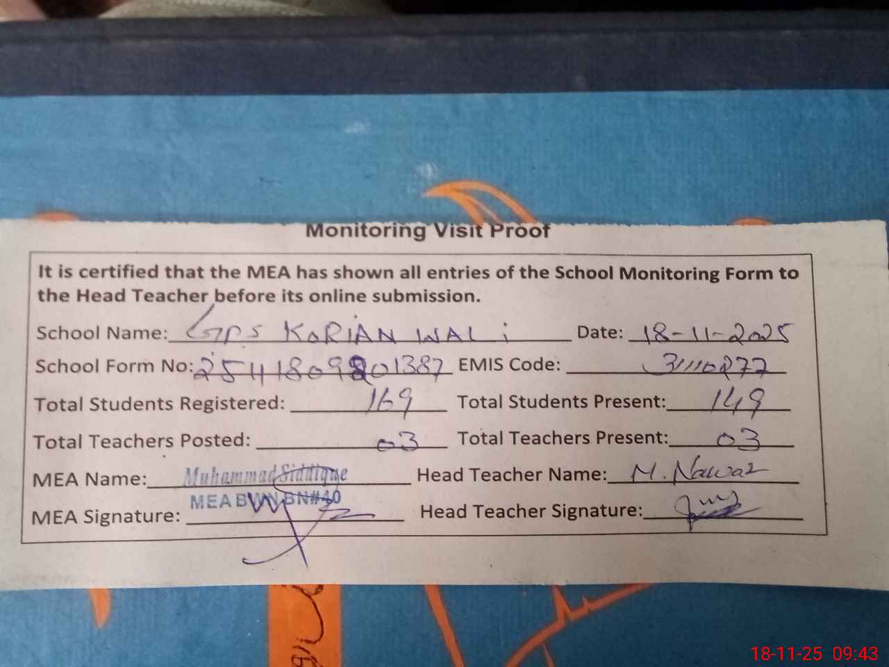 | EMIS Code: 31110277 | Name of School: GPS KORIAN WALI | |||