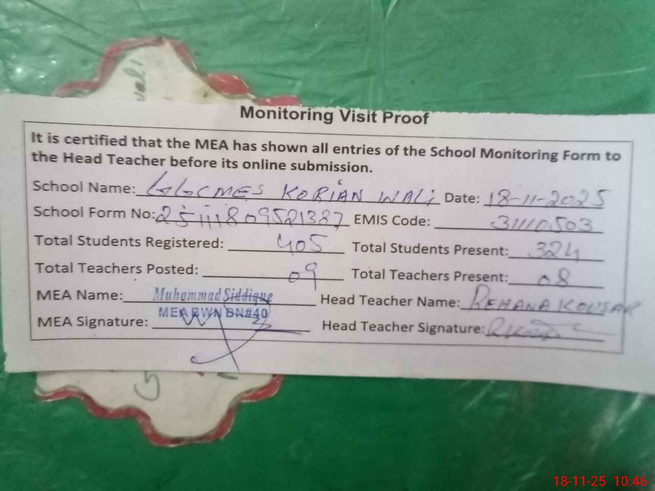 | EMIS Code: 31110503 | Name of School: GGMES KORIAN WALI | |||