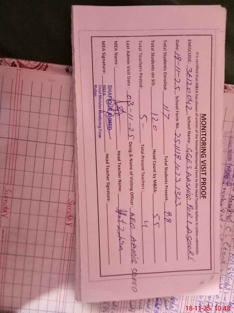 | Attendance Register | Head Teacher | MEA with School | Visit Proof |