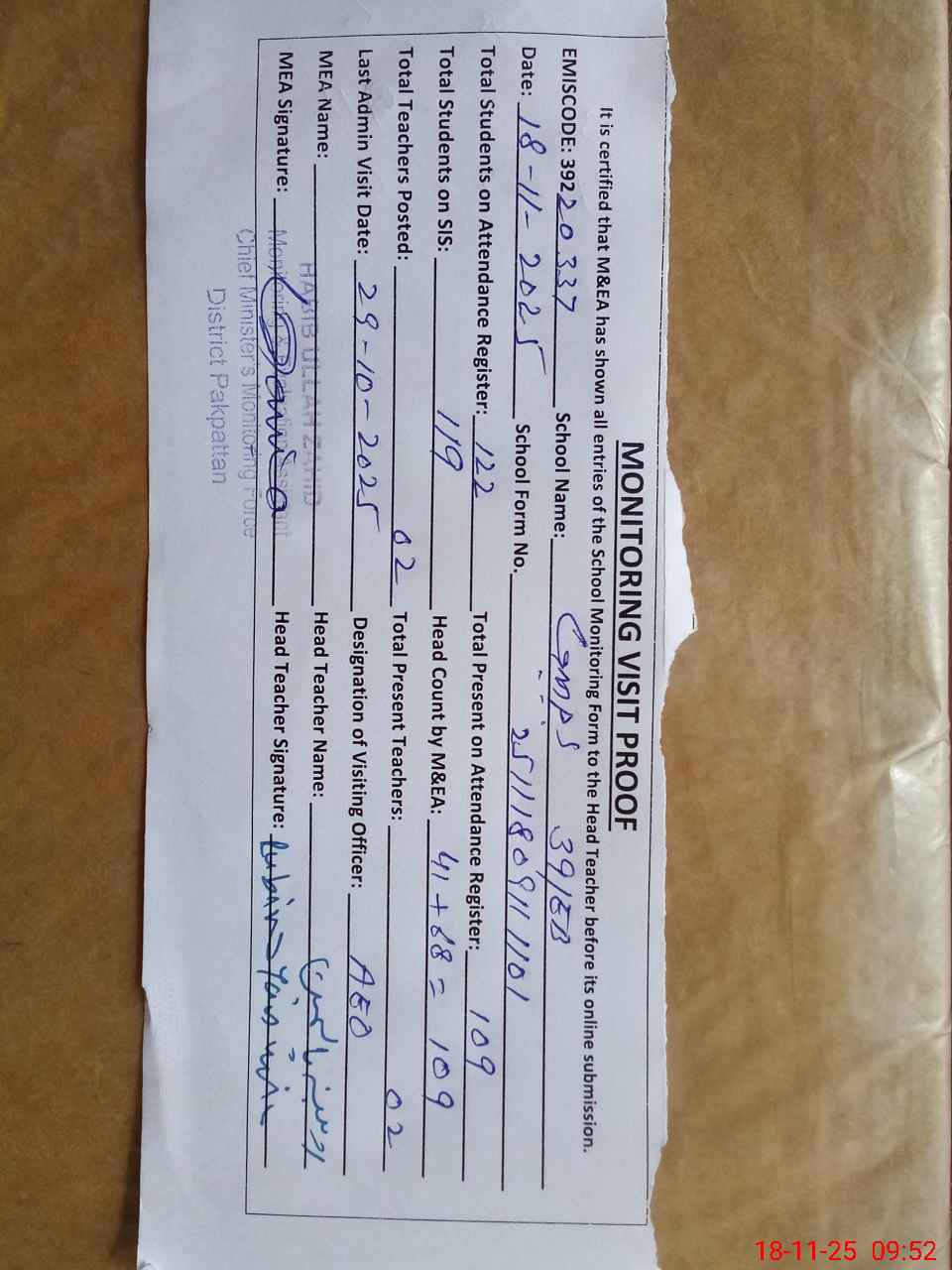 | EMIS Code: 39220337 | Name of School: GMPS CHAK NO 39 EB | |||