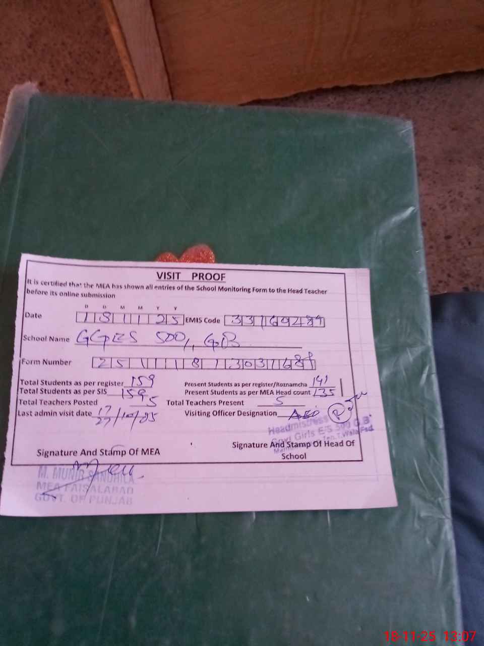 | EMIS Code: 33160289 | Name of School: GGES CHAK 500 GB MAMUNKANJAN | |||