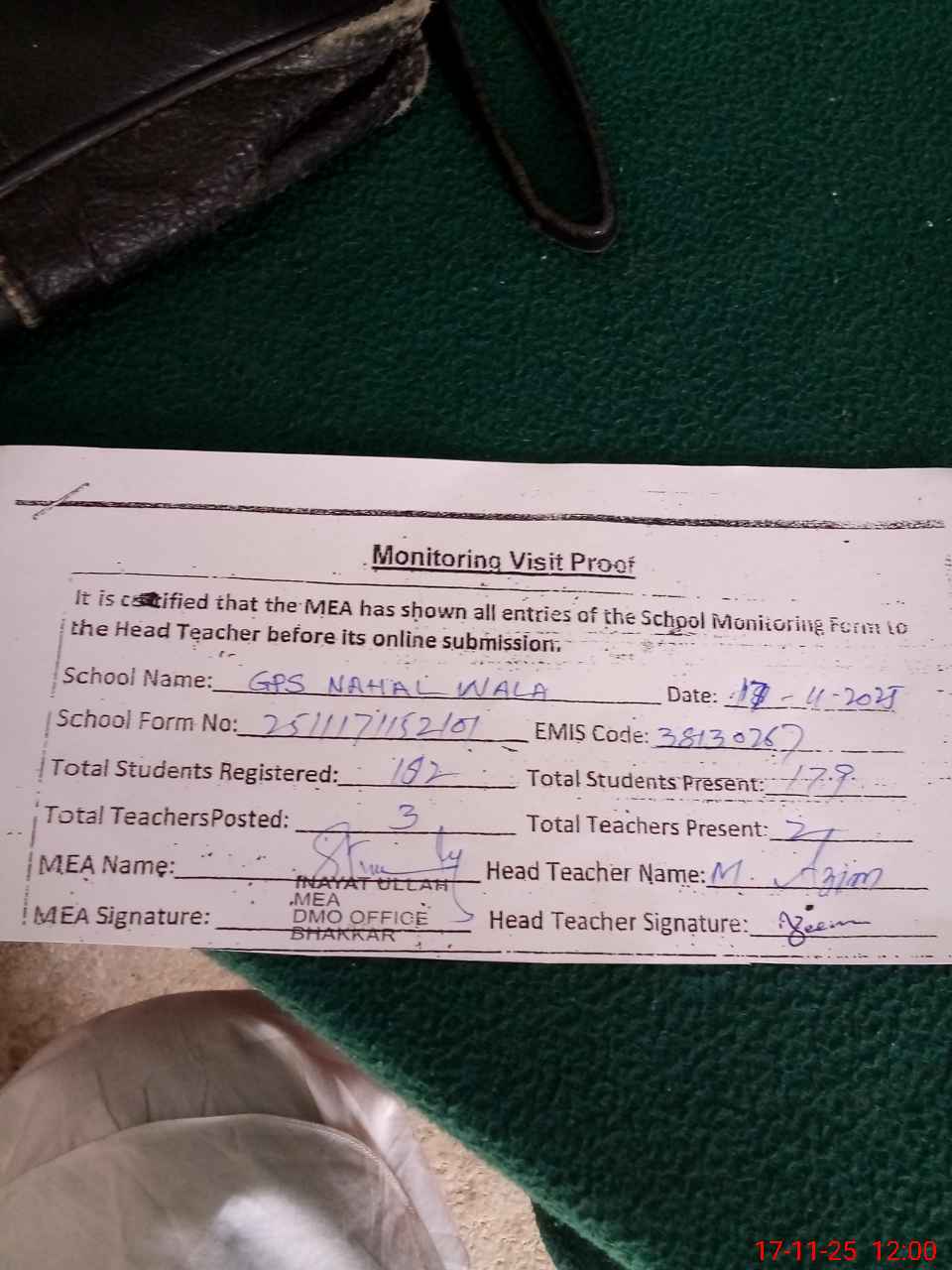 | Attendance Register | Head Teacher | MEA with School | Visit Proof |