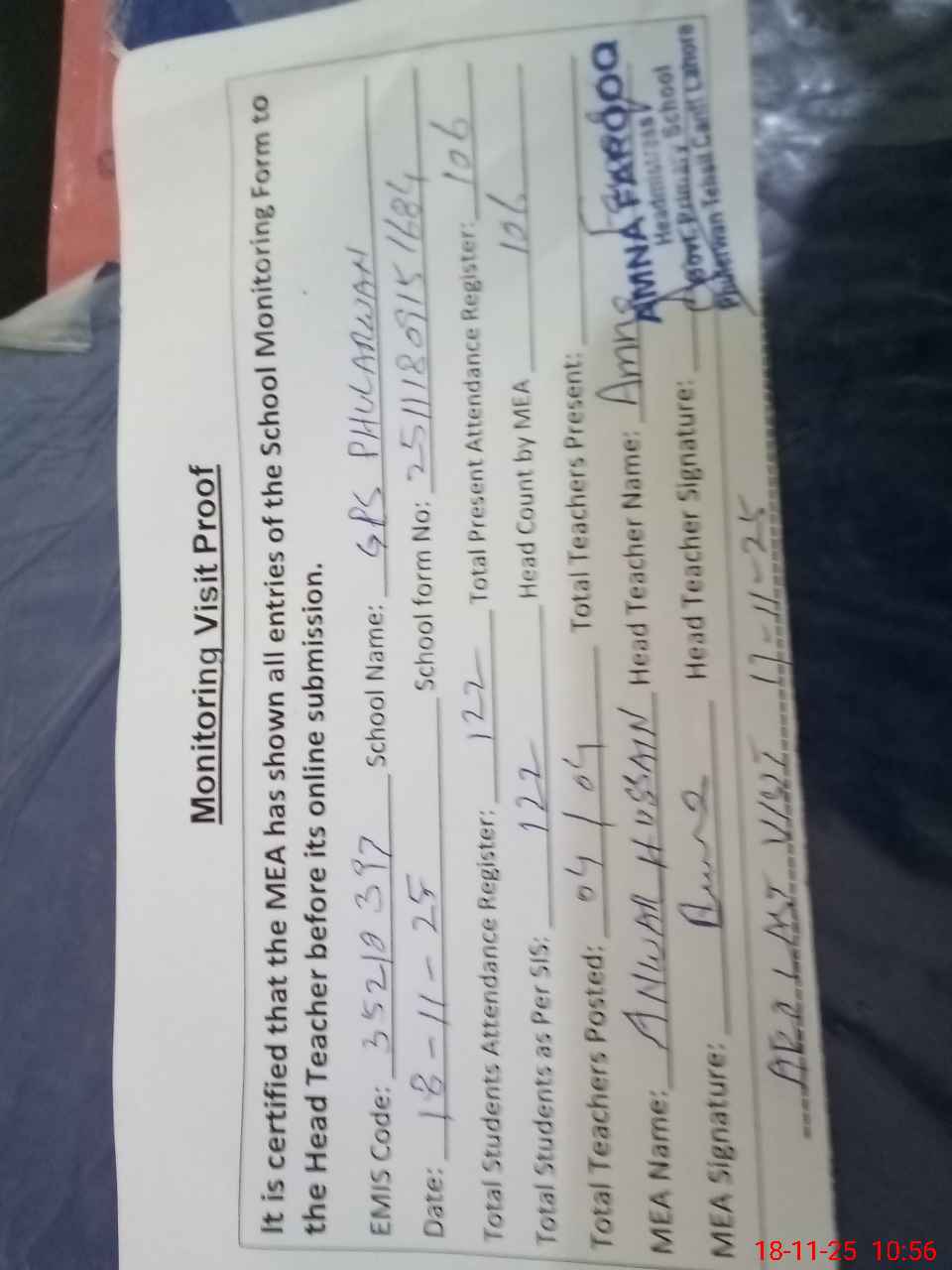 | Attendance Register | Head Teacher | MEA with School | Visit Proof |
