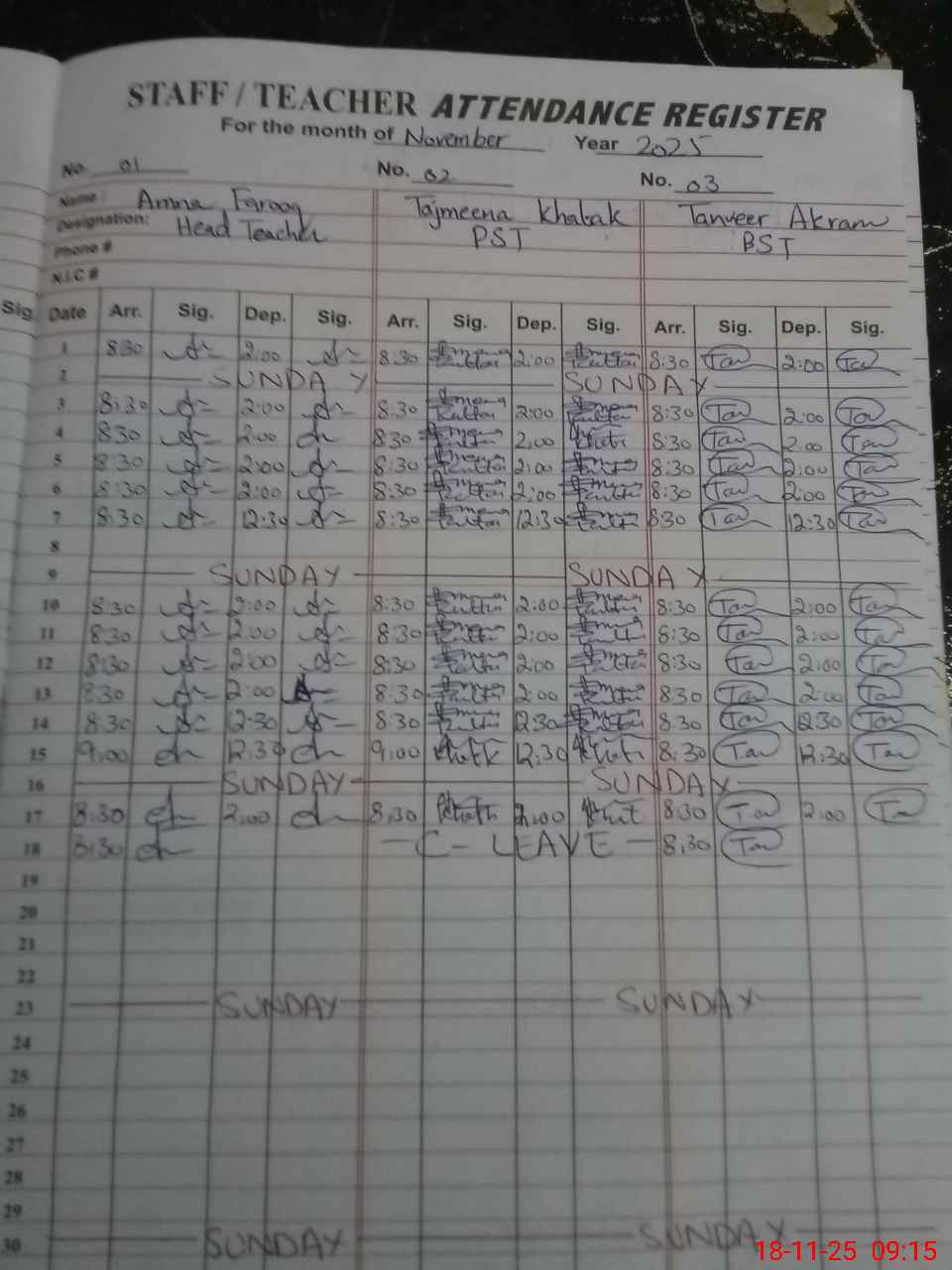 | CNIC | Full Name | Designation | R/C | Absence During Last Calender Month |