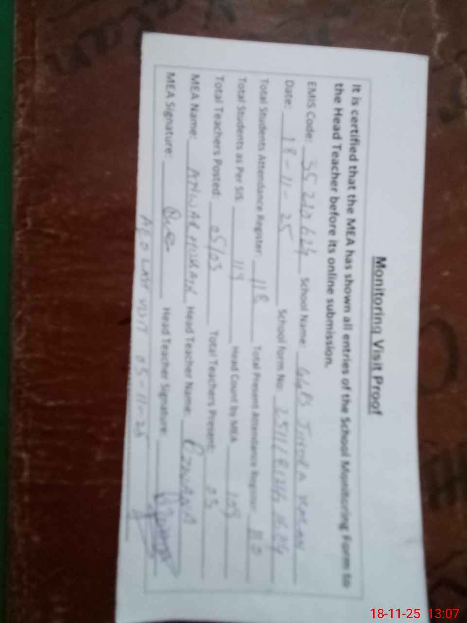 | Attendance Register | Head Teacher | MEA with School | Visit Proof |