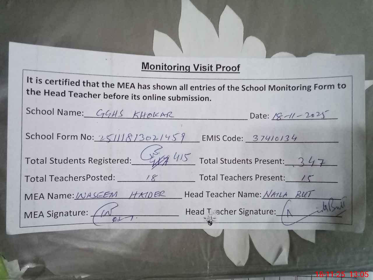 | Attendance Register | Head Teacher | MEA with School | Visit Proof |