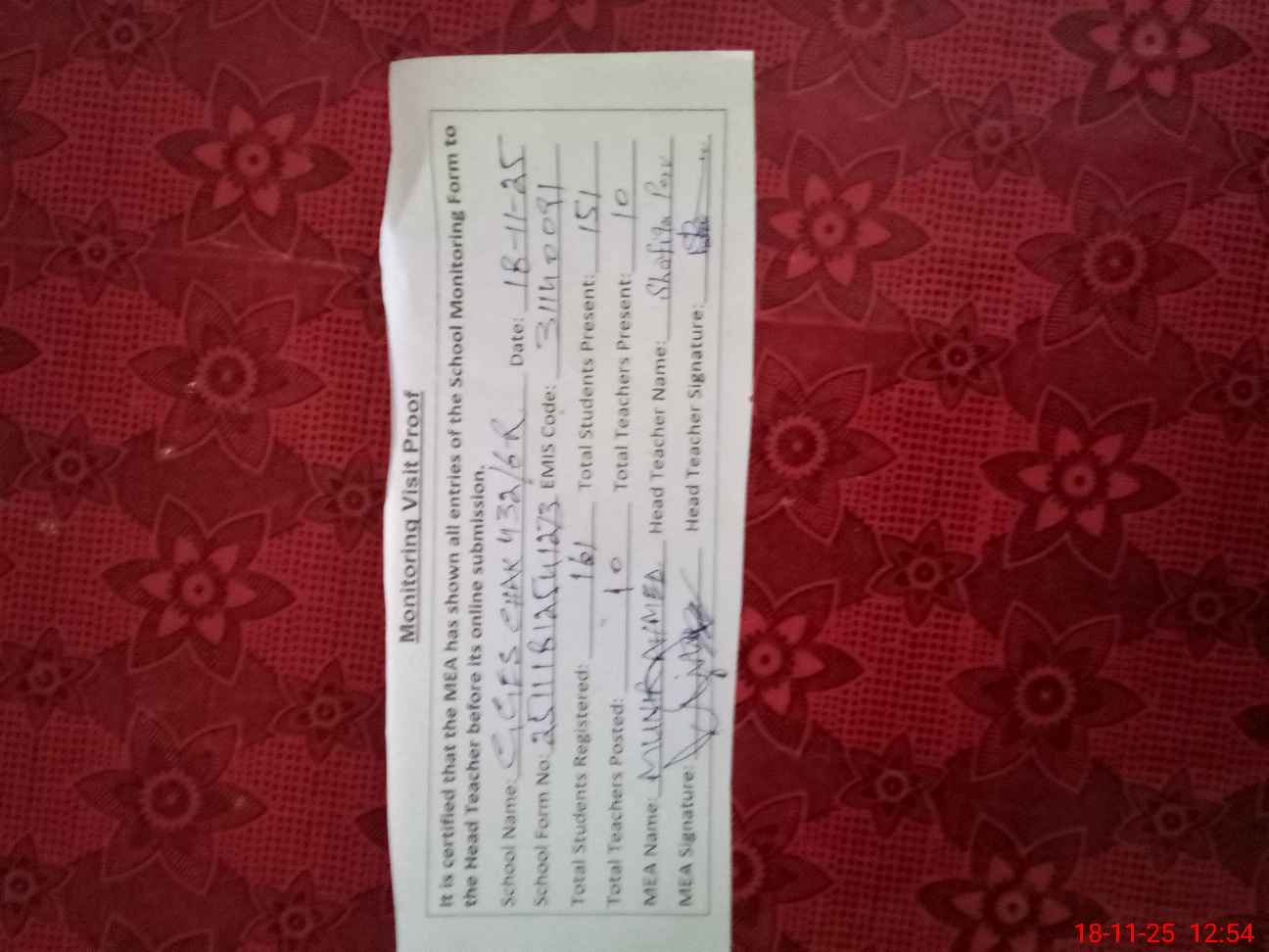 | Attendance Register | Head Teacher | MEA with School | Visit Proof |
