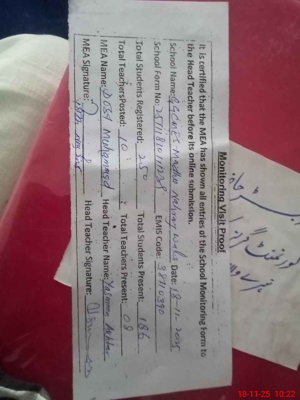 | Remarks (Use Separate Page if Required): All the entered data loudly share with the head teacher before submitting Last visited the subject school by Educational Authority Sadia Qayyoum AEO 13th October 2025 | |||||