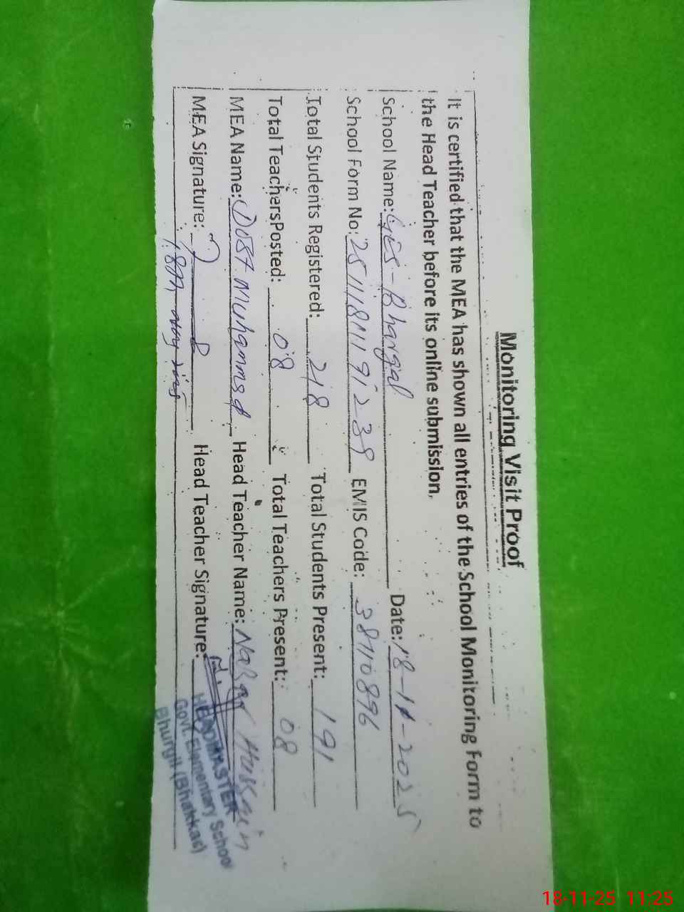 | Remarks (Use Separate Page if Required): All the entered data loudly share with the head teacher before submitting Last visited the subject school by Educational Authority Istiqlal Hussain AEO Dated 13th October 2025 | |||||