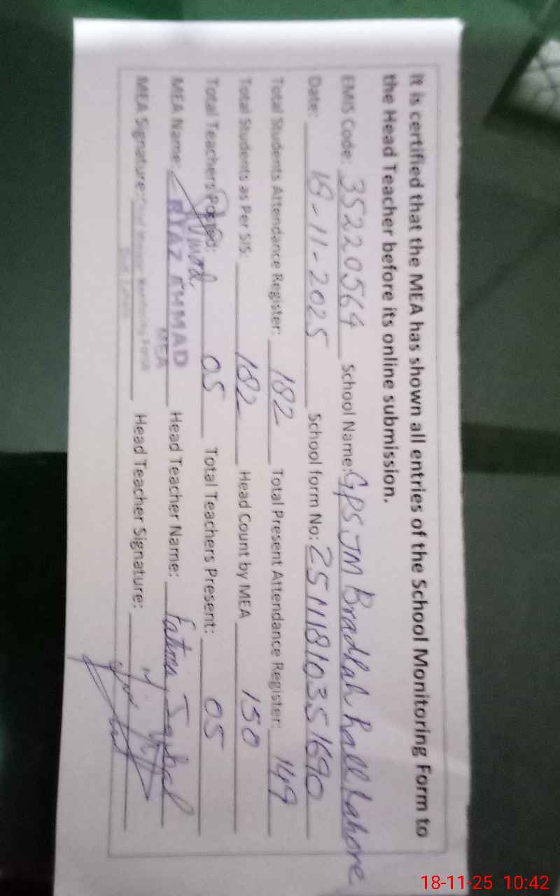 | EMIS Code: 35220564 | Name of School: GPS JUNIOR MODEL BRADLAUGH HALL RATIGAN ROAD (EX-MCL) | |||