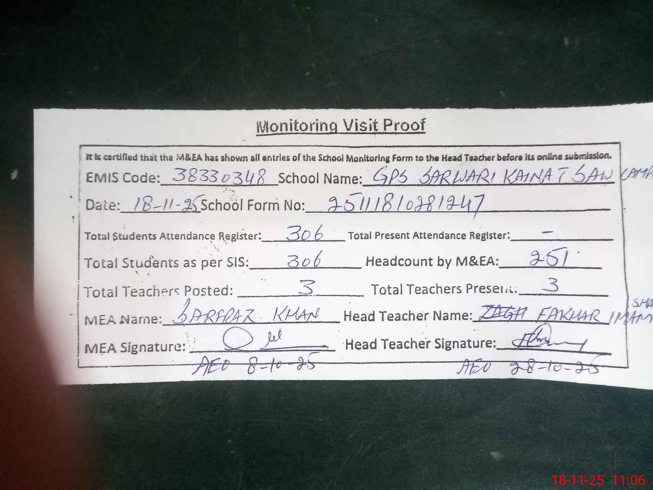| Monitoring Date: 18-11-2025 | Start Time: 18-11-2025 10:28 AM | End Time: 18-11-2025 11:09 AM | Name of MEA: SA**** AH**** KH**** | |