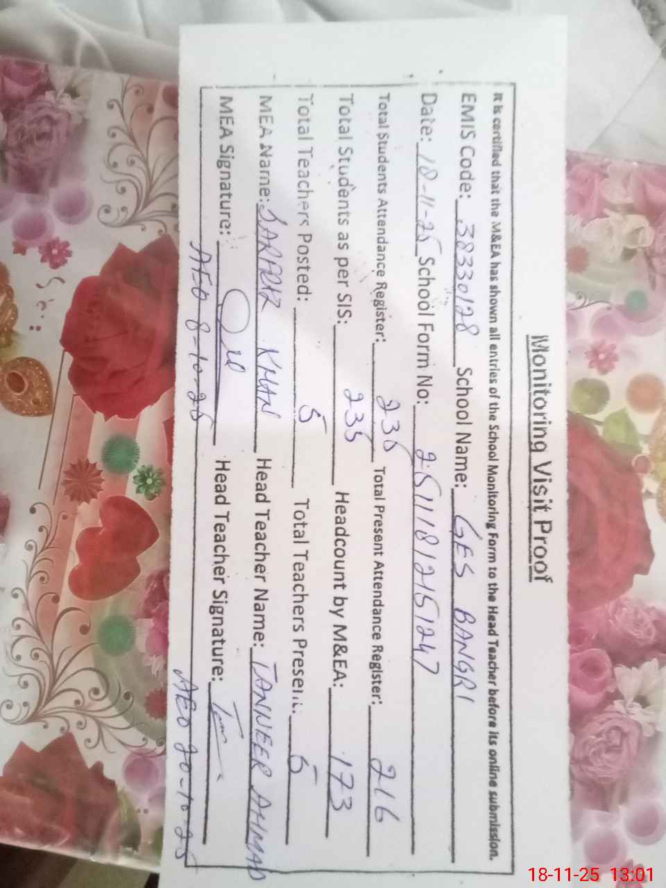 | Attendance Register | Head Teacher | MEA with School | Visit Proof |