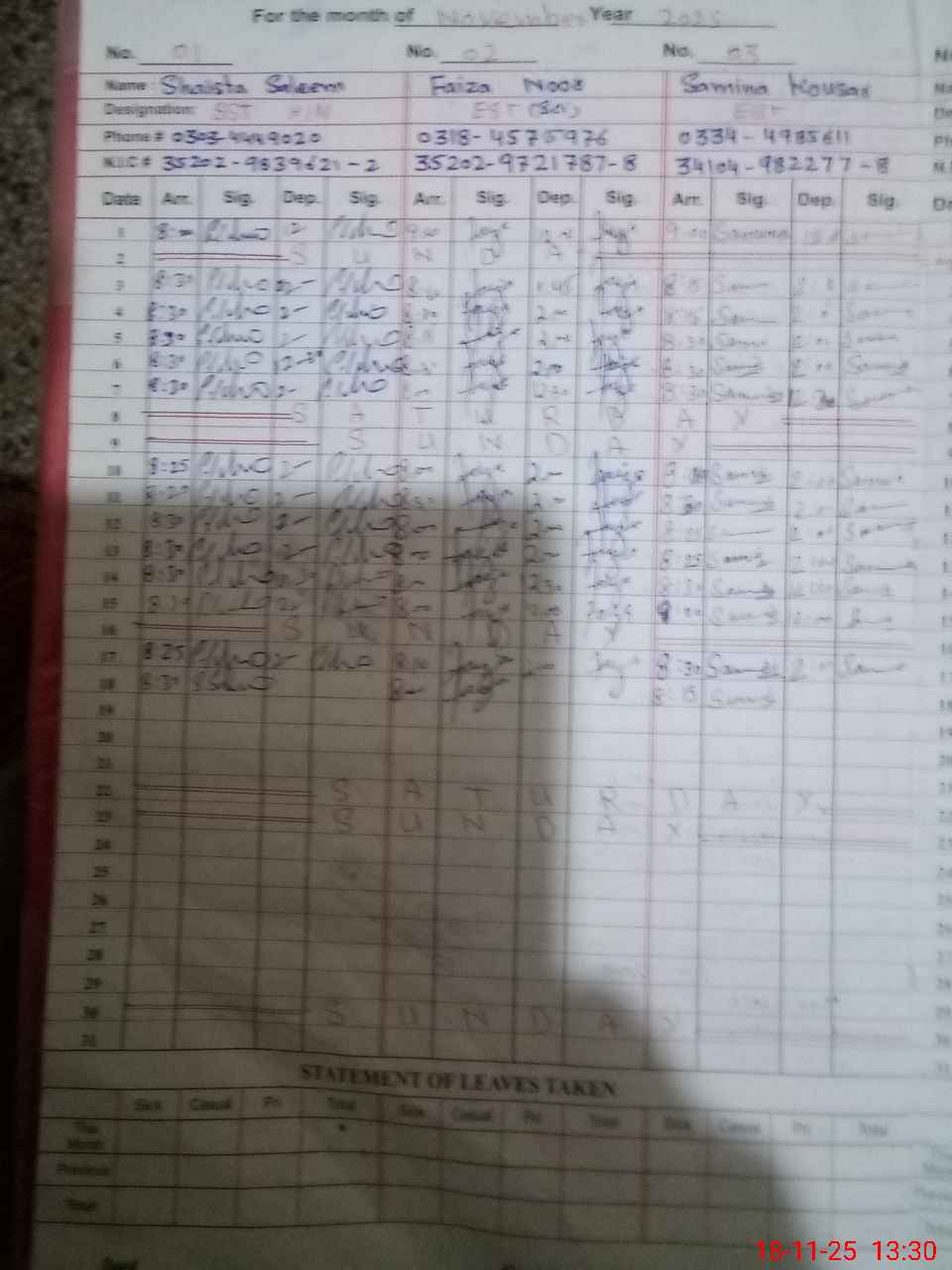 | CNIC | Full Name | Designation | R/C | Absence During Last Calender Month |