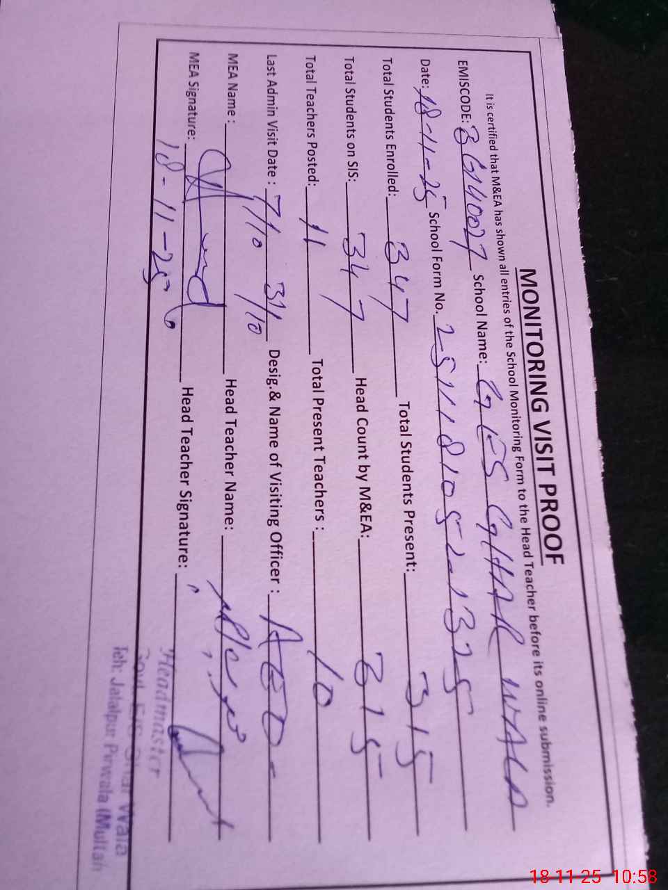 | Attendance Register | Head Teacher | MEA with School | Visit Proof |